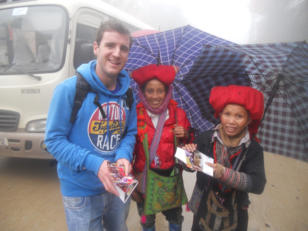 The town of Sapa, though misty and somewhat mysterious is quaint and peaceful. There are lots of cosy little cafes, little shops and stalls selling colourful clothes and jackets. Warm clothes are needed, the jeans we thought we were putting away indefinitely in Hanoi were back in force. There were lots of what Diarmo came to call ‘hill people’ wandering the town selling bits and pieces, they come at you speaking funny words and it’s hard to get them away without actually buying something. I’m pretty sure this picture cost me a few dong.