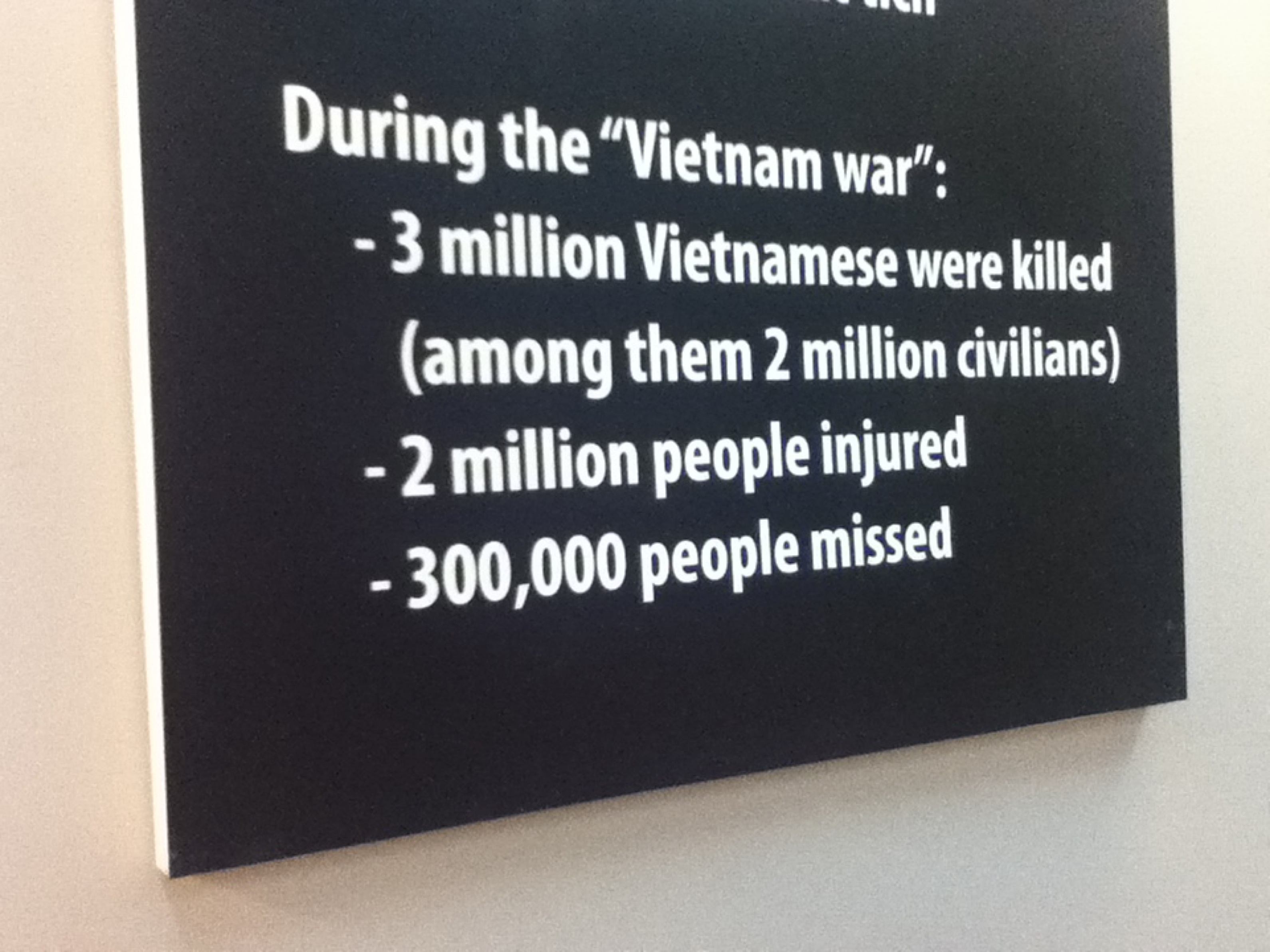 There were still 3 floors of the museum above us… The pictures were not as jaw-dropping on the above floors but still so moving and you could not help but feel empathy for this country that is still overcoming the pain and suffering experienced just 40 years ago. The suffering inflicted by the Americans soldiers on the Vietnamese was simply appalling and I am not talking about the Vietnamese fighting for their country, the civilians were slaughtered without reason and many quotes indicate how the American soldiers cared not if it was a soldier, a civilian or even a child who was before them, in many cases they would kill them without hesitation. The museum was made up mainly of pictures and they tell the story of the carnage better than words ever could. Although it was quite upsetting to see the brutality of it all, experiencing things like this show you what war is like and however upsetting it may be, it is reality for many people around the world. After leaving the museum, we were walking down the road in a busy part of Saigon when we saw a child lying on a trolley on the path, a child with awful deformations just like the ones we saw in the pictures. There it was, the reality.