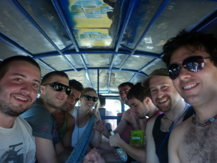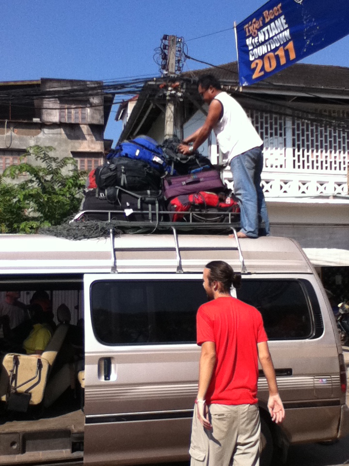 So thankfully on the morning of the 28th we were getting the hell out of Vientiane, off to a more adventurous place, the legendary Vang Vieng. We got up early and headed out to our bus. The bus wasn’t so much a bus as a minibus, actually no it was a van. It seemed that everyone taking the bus was new to the way of the Laos because we watched in disillusion as the driver climbed onto the roof with our bags and tied them together with a string. I asked them would they be ok and he replied “yes, yes, ok”. He seemed reassuring but the smell of his morning whiskey made us think otherwise.