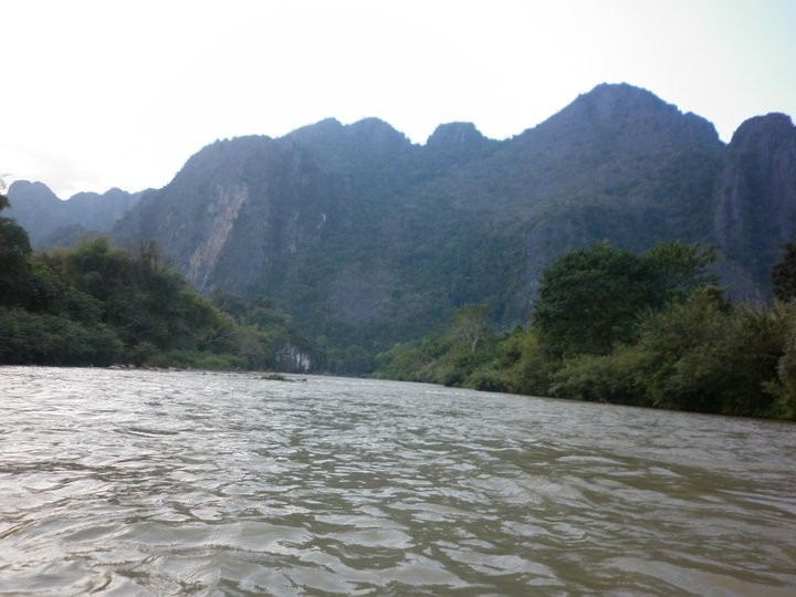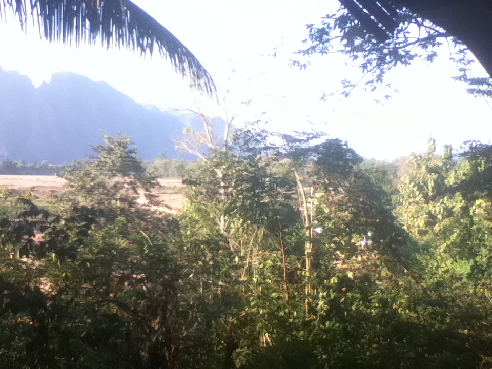 It wasn’t long before we saw how beautiful Laos is. The hills and mountains are so unique in their shape and stature and the countryside is as green as Ireland only a bit more tropical. Our bus ride took us through many little towns and villages and seeing the way the people live is just fascinating. The major industry amongst the villages in Laos is making weaves and as you drive through, you see men, women, children of all ages joining together in the trade. The houses are wooden, on stilts, with thatched roofs, the clothes of the people are rough and torn, but they look so happy in their little civilisations. So after a very bumpy bus ride through the hills on the concrete-less roads, we reached Vang Vieng and our monkey treehouse.