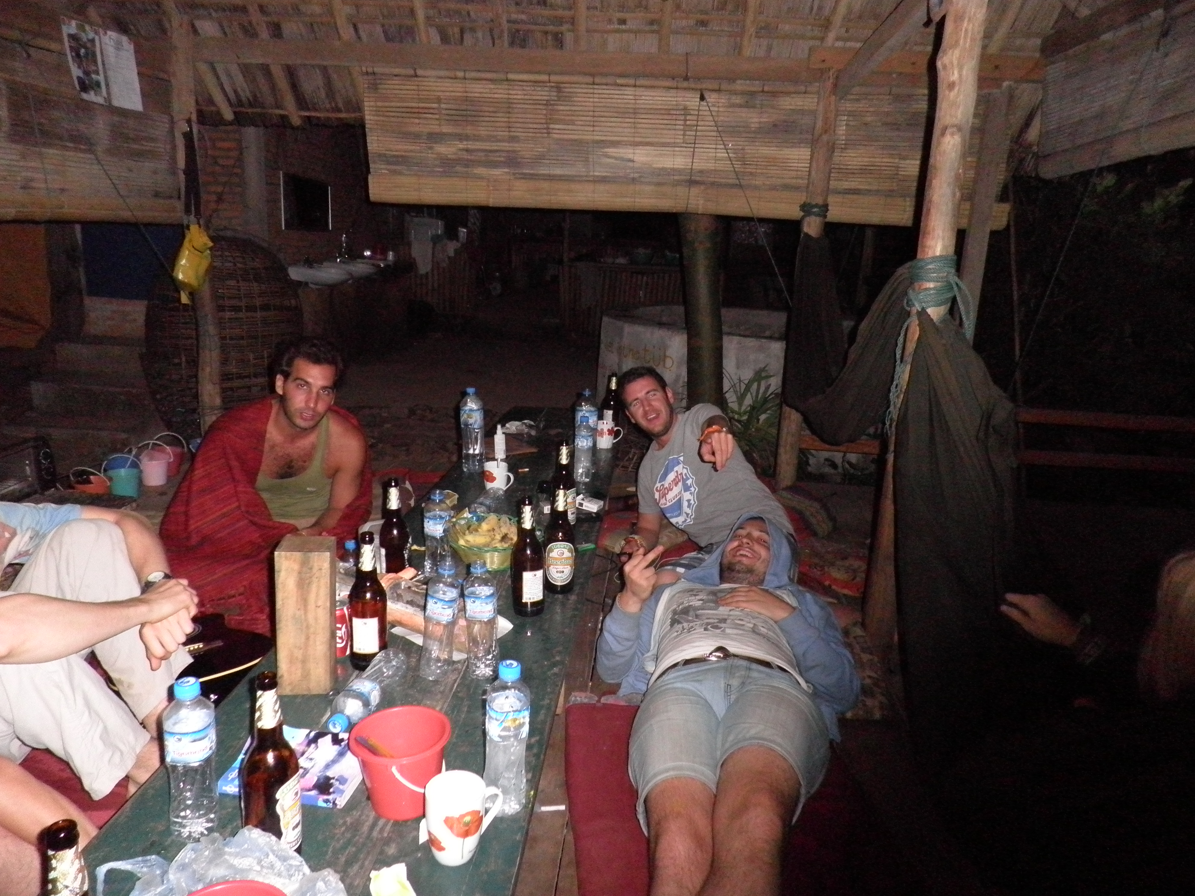 The next two days were not nearly as enjoyable as the previous two. On new years day, we could barely function, more out of tiredness than being hungover. The novelty of the treehouse was wearing off, the beds were uncomfortable and at night time it was like sleeping in an igloo it was so cold. Several hours of New Years day were spent watching Friends, that was the highlight of the day! Byron on the other hand found his form on the morning of New Years day, he partied so hard he came back in the evening with ideas of changing his plans to go travelling with Guy and Ben because he wanted to “have fun” and “party”, he was very very very drunk. Andy was mad. Diarmuid and I weren’t so much mad at Byron, it is hard to be mad at him, he’s such a nice guy, we were just so confused, a day of drinking and he had a new itinerary for January. He of course crashed in the evening. After dinner I was hunting for a companion to watch the Liverpool game with. I did head to the Irish pub nearby and was enjoying the first 15 minutes when a strange thing happened. The pub closed. An Irish pub closing at 10.15. An insult to our great nation. Byron came out with me to watch it somewhere else and we talked about how mental he was, but he seemed set on his plans. The next morning he woke up and realised he is an idiot. Below he is pictured almost passed out and wondering where he was the past 24 hours. He apologised to Andy who had already considered coming with us for the next few weeks. And then we had to say goodbye to the lads, which was really shit. Despite some antics from Byron, we had a great time with them once again and if it wasn’t for them we wouldn’t have even been in Vang Vieng for New Years.