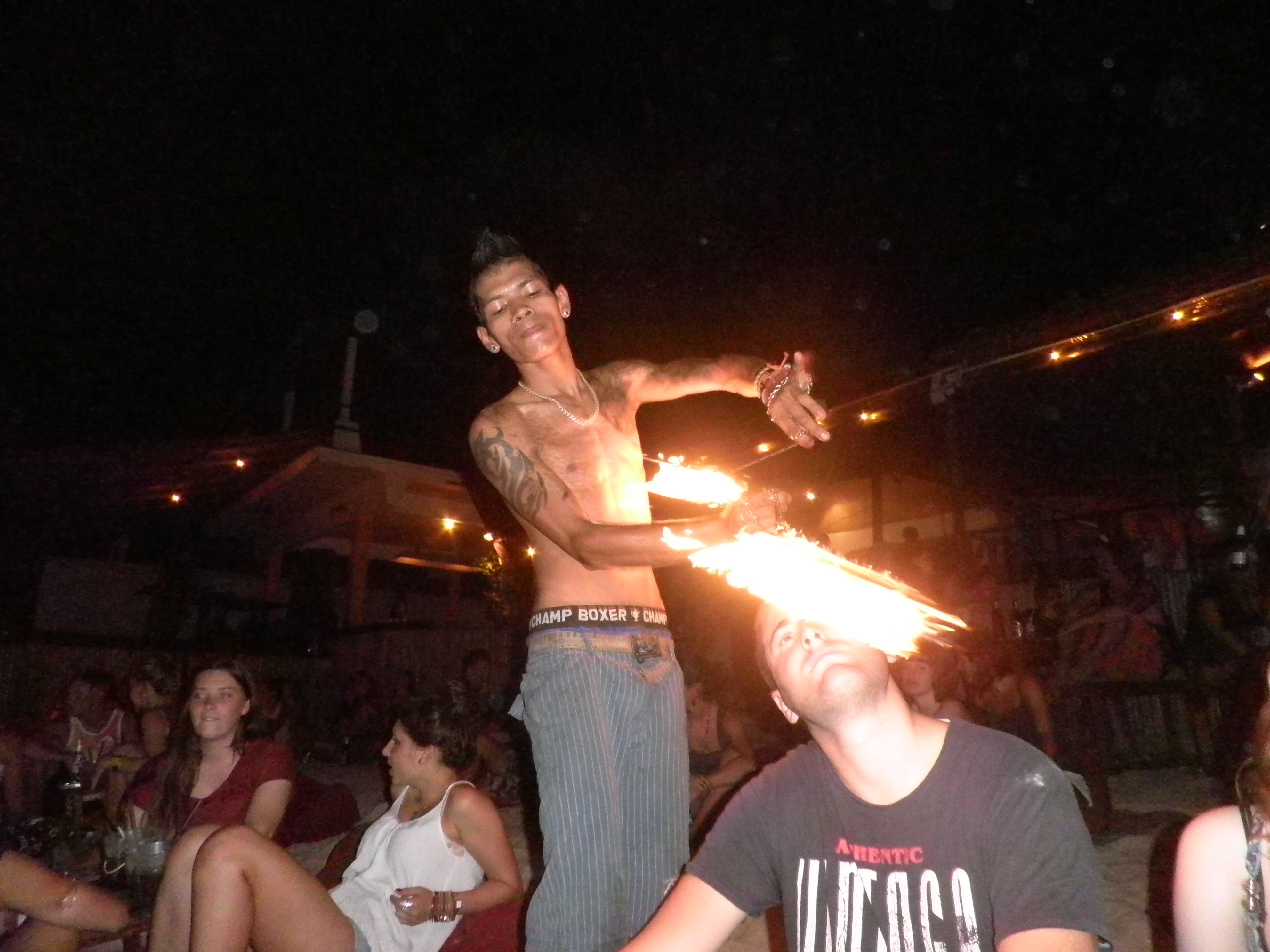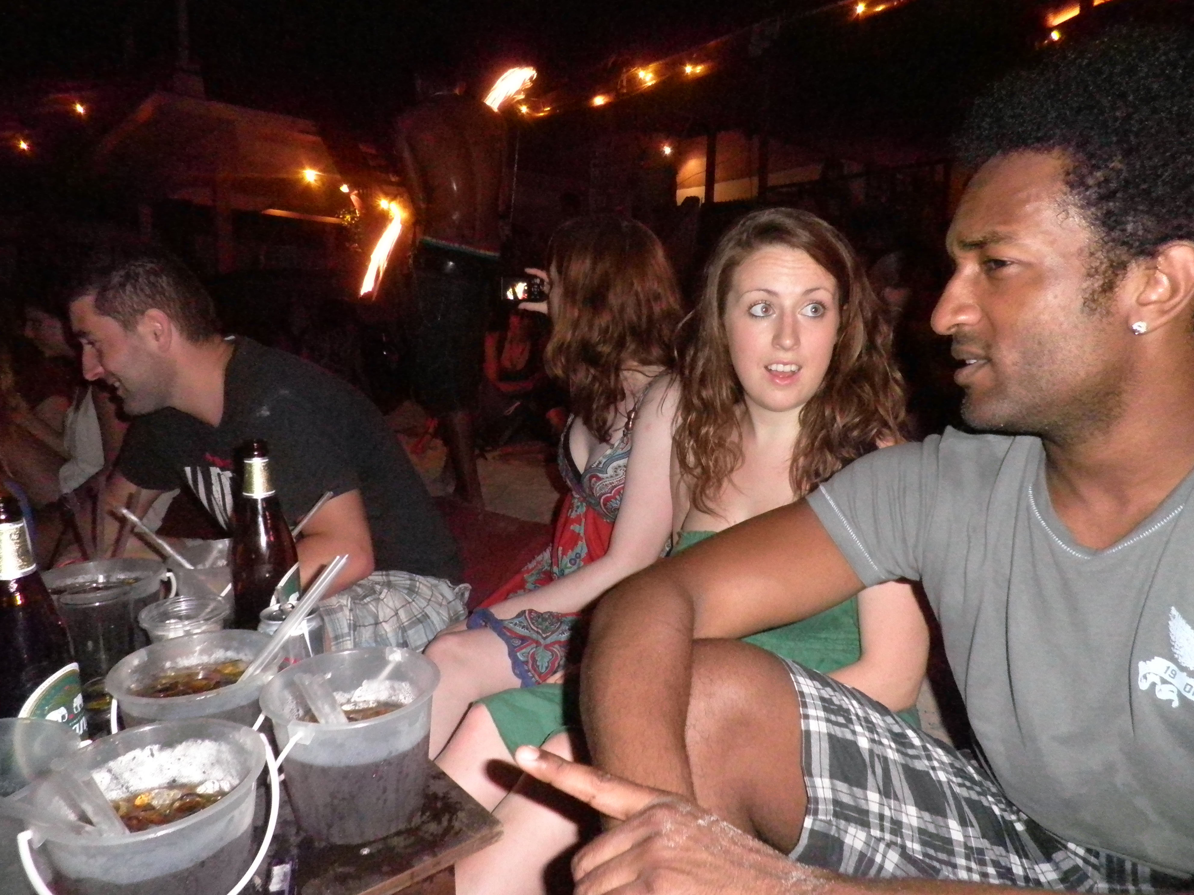 Kho Tao is probably the most beautiful of the three islands, I say probably because we know the other islands as much as we know the Antarctic. Nonetheless we liked Kho Tao instantly; we found a nice guesthouse right by the beach and right beside a bar which would become our local. The sad fact is, most days we would not venture out of a 200 metre radius, hotel room to the place we ate breakfast to internet cafe to dinner restaurant to bar. But feck it we had some brilliant nights out in Lotus bar. Cushions and little tables were spread out just yards from the sea, buckets were 2 for 1 and Burmese fire playing dancers were the nightly entertainment. We had briefly met 3 very nice Irish girls on Kho Phangan and met them on our first night on Kho Tao. Rachel, Gabi and Alice, 3 legends and we spent our nights with them. What was very impressive about the girls was their ability to keep up with us; in fact there were nights where they were begging us not to go to bed at 4 am! The crowd in Kho Tao were friendly and laid back; we met lots of great people… And this continent is ridiculously small… You never know when certain Swedish girls will pop up out of nowhere. Don’t worry Ela 🙂