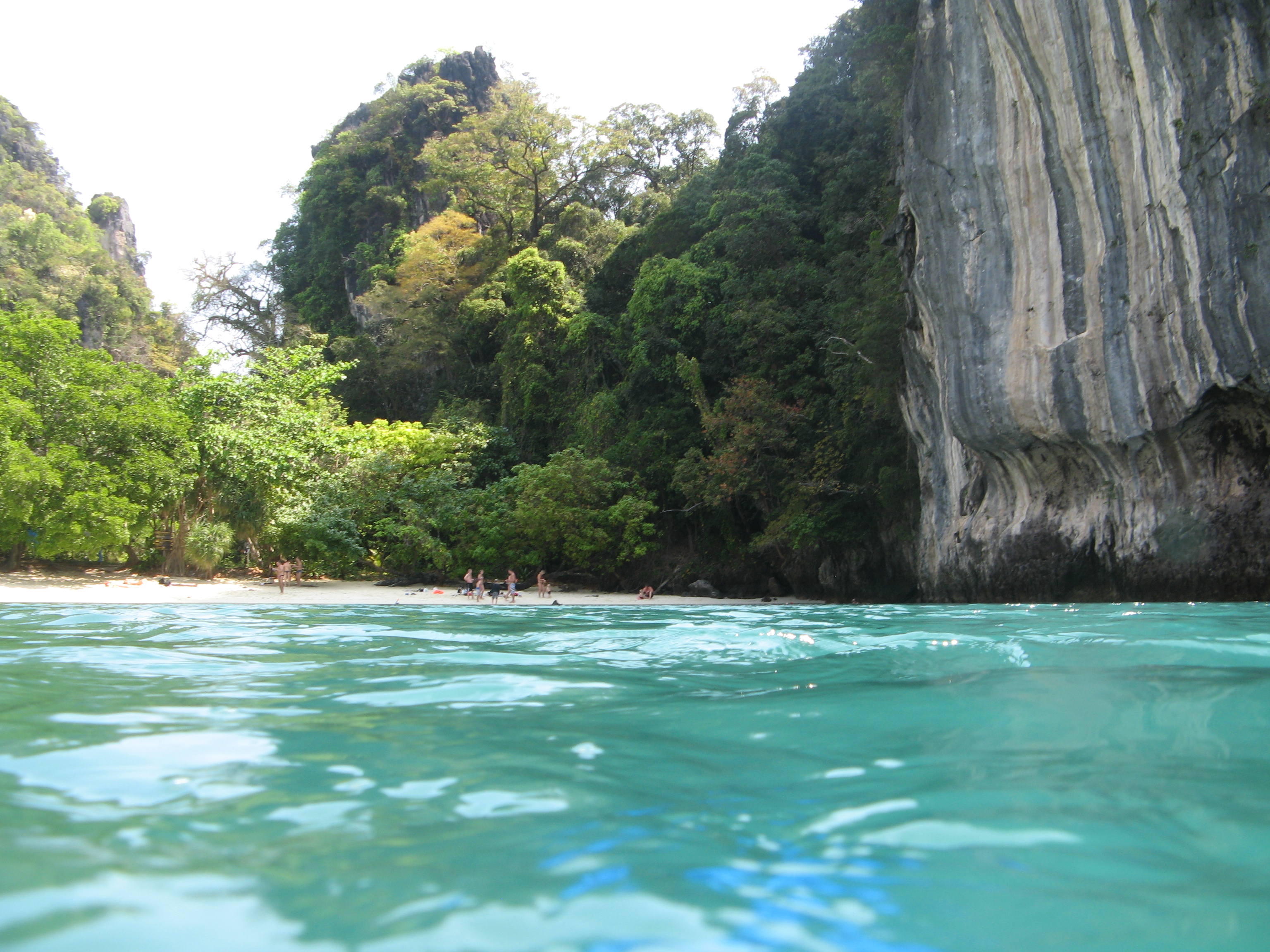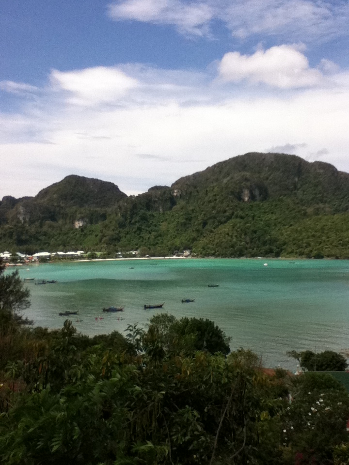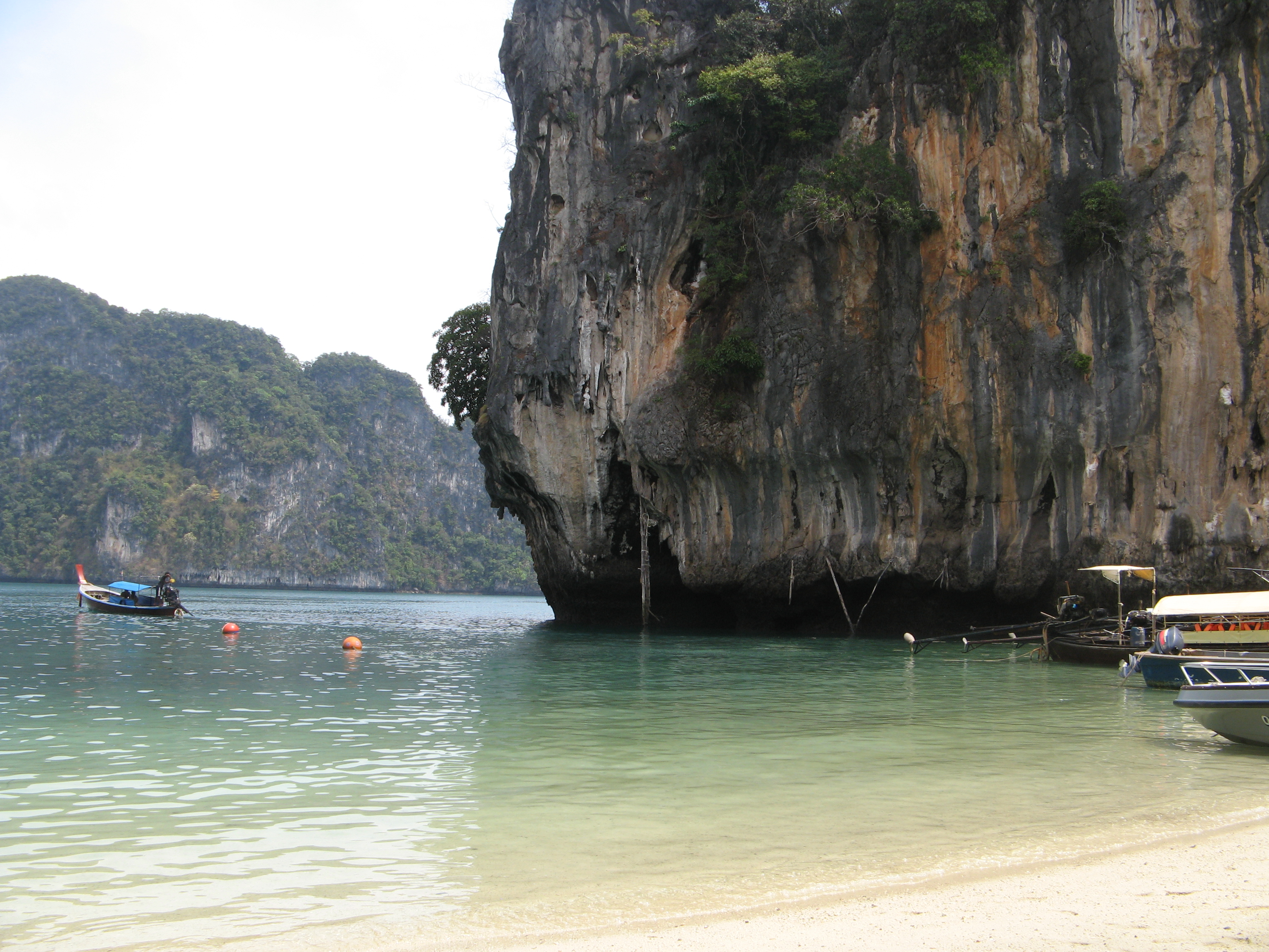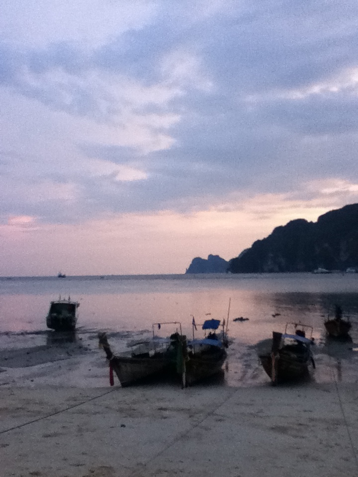 So we took a kayak out on the bay the following morning and what a feeling it was being up and feeling fresh, out in the peaceful bay admiring the scenery all around us. We stopped at several little isolated patches of sand and it felt like this was a world to ourselves, not a soul in sight. Diarmo got very philosophical out in this peaceful environment and decided he needed to let himself go and do something weird. It’s a week later and he has 3 tattoos and 2 piercings… Only joking don’t worry Mary he only got the piercings! So the following day we took a boat tour to nearby islands. Ourselves and two German couples set off and the weather was perfect for the day. So we were brought to some of the most amazing beaches we have ever seen, so untouched and so magnificent. We also saw much evidence of how the tsunami ravaged the islands in 2004. So our day was spent swimming in the beautiful turquoise water, laying on the sand and appreciating that this was actually paradise. So that night we all had dinner again and there were two very nice Norwegian girls there who we had a brilliant talk with. As Diarmo said afterwards, they were 2 of the nicest girls we had met in a long time, to quote him – ‘it was so great that they weren’t geebags’. We actually were sad to leave Krabi, our bodies and minds had been rejuvenated but our next stop was one of the most anticipated of the whole trip, Kho Phi Phi.