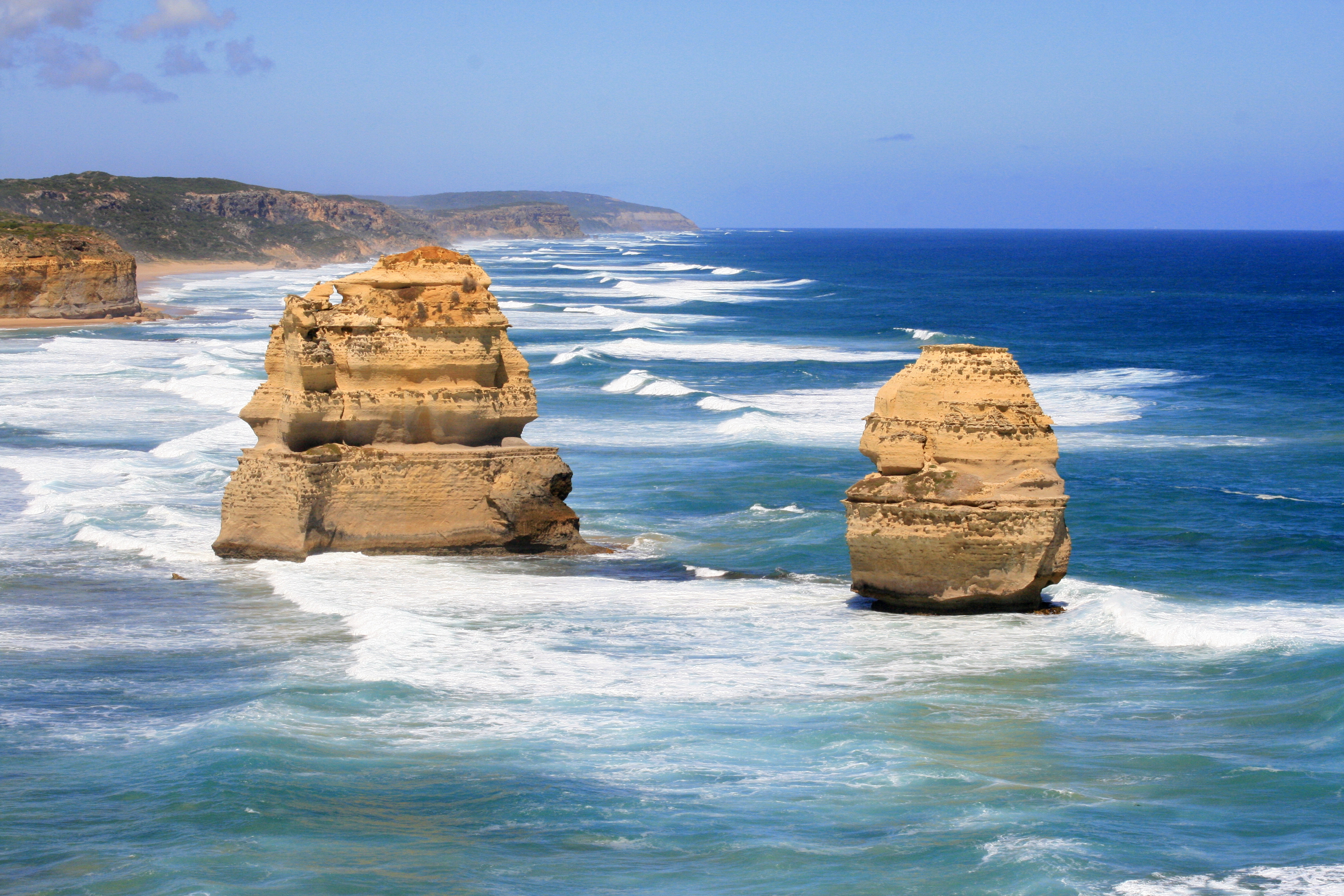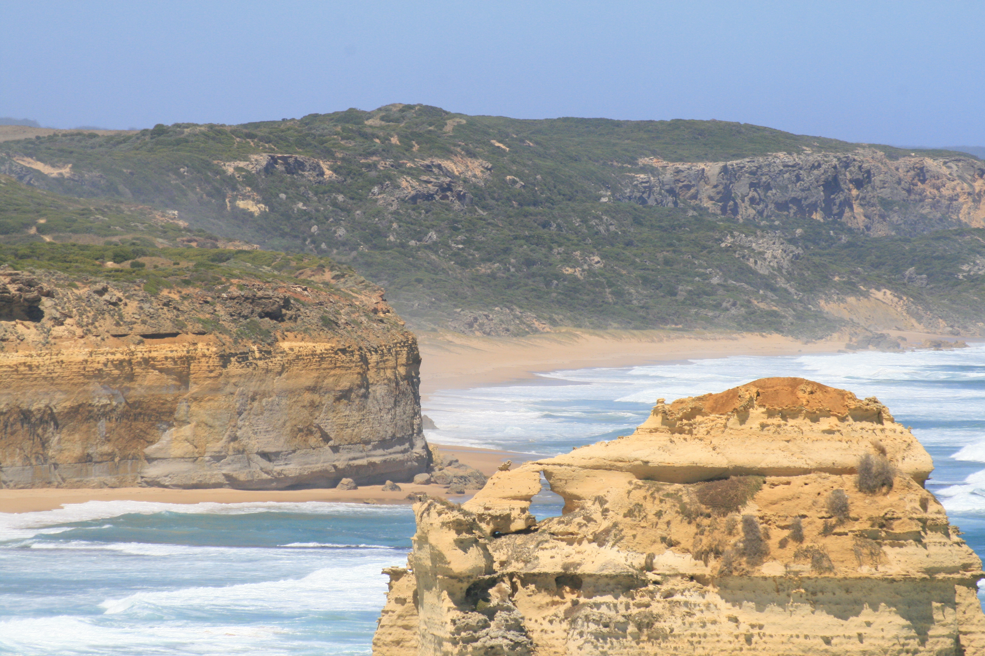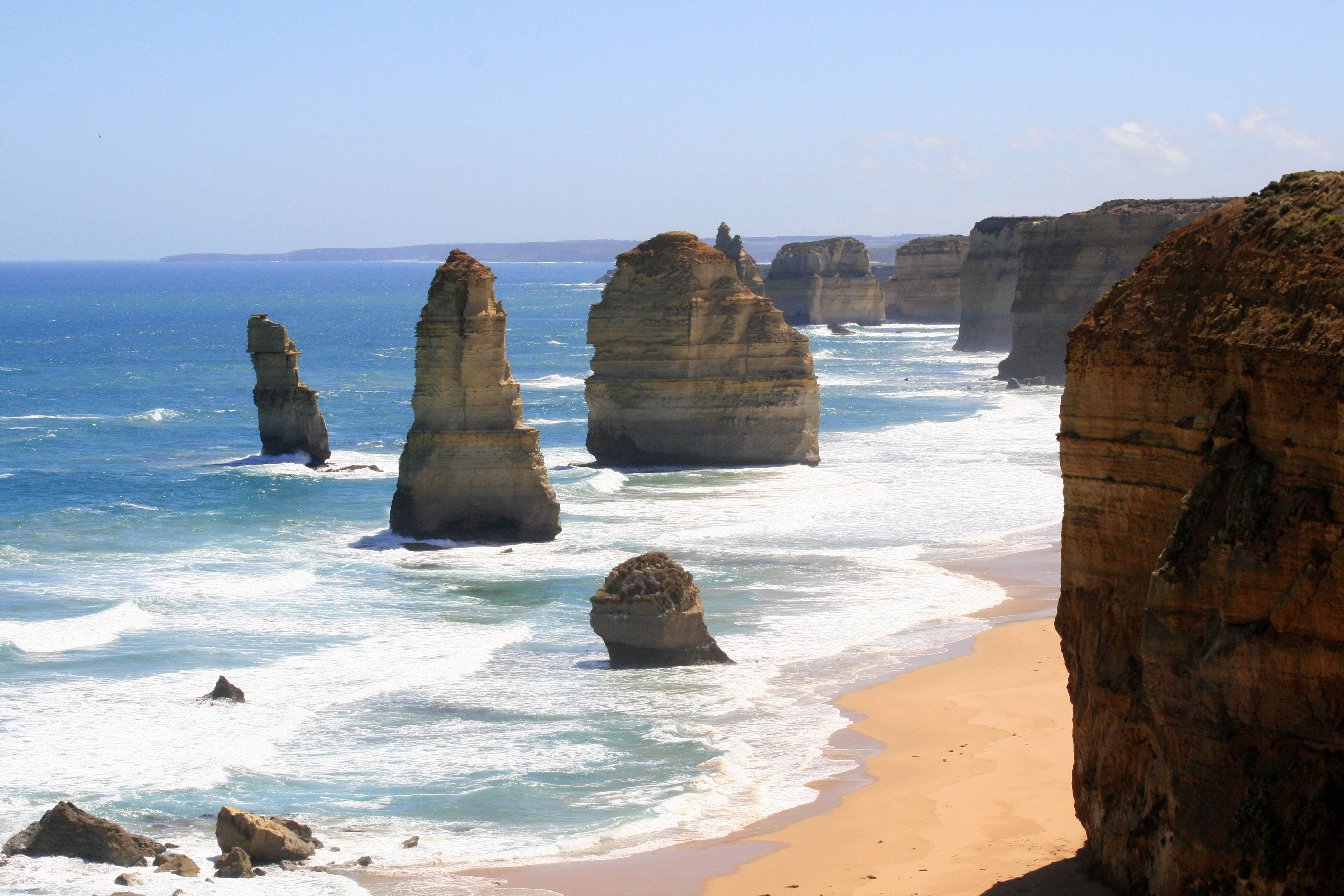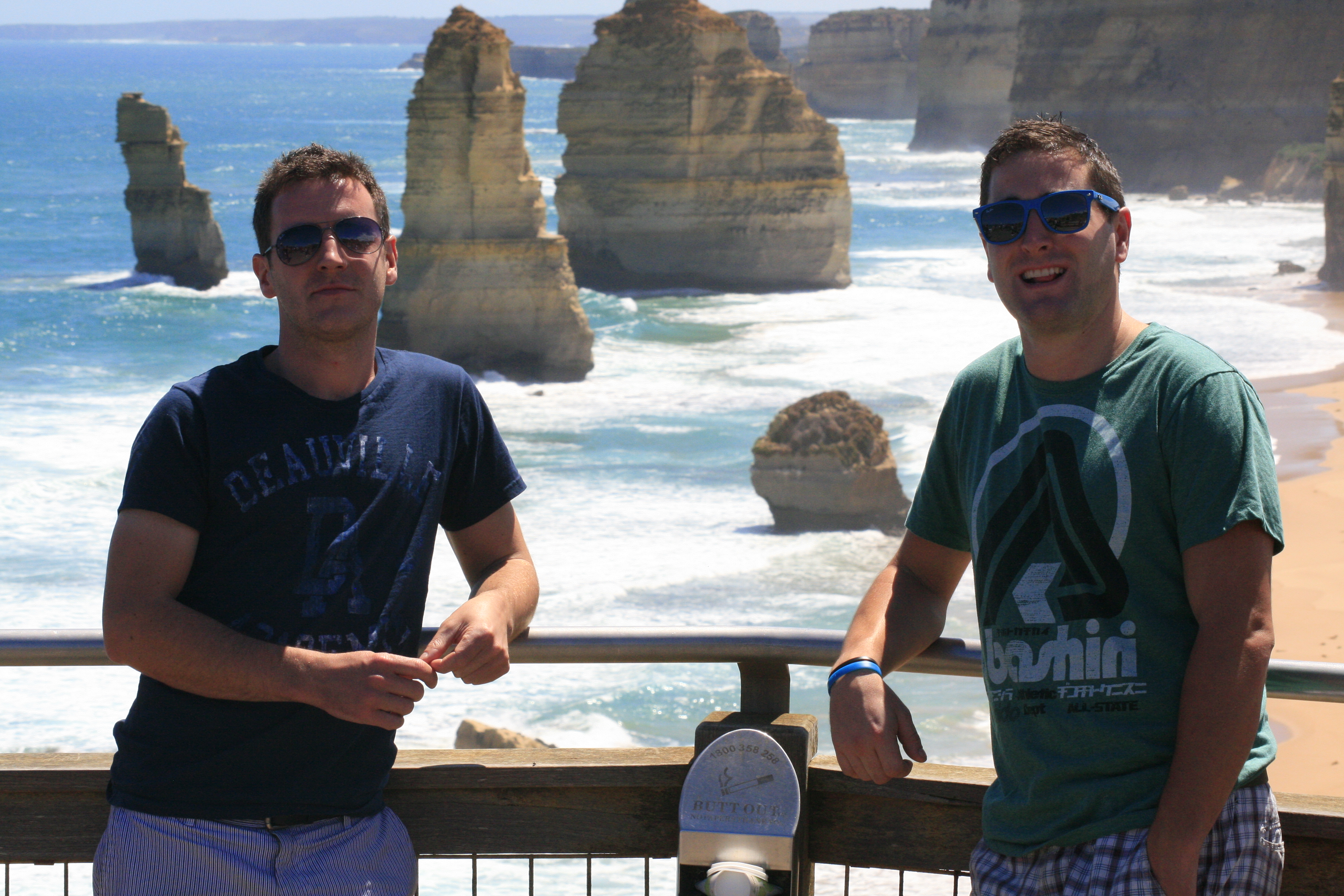 Our first stop was Bell’s beach where big surf competitions are held and Diarmo and I were so hyper at being on the road again we ran down to the freezing cold water and played like dogs on the beach. Later on we stopped at a few other lookouts over white sandy beaches; waves crashing against them viciously. The shining light of the Great Ocean Road is ‘The Twelve Apostles’, a collection of limestone stacks just off the shore. There aren’t actually 12, but I am sure at one point there were. They are magnificent on sight and especially on a bright sunny day. In fact, we’ve seen the rainy day photos, they aren’t so great then.