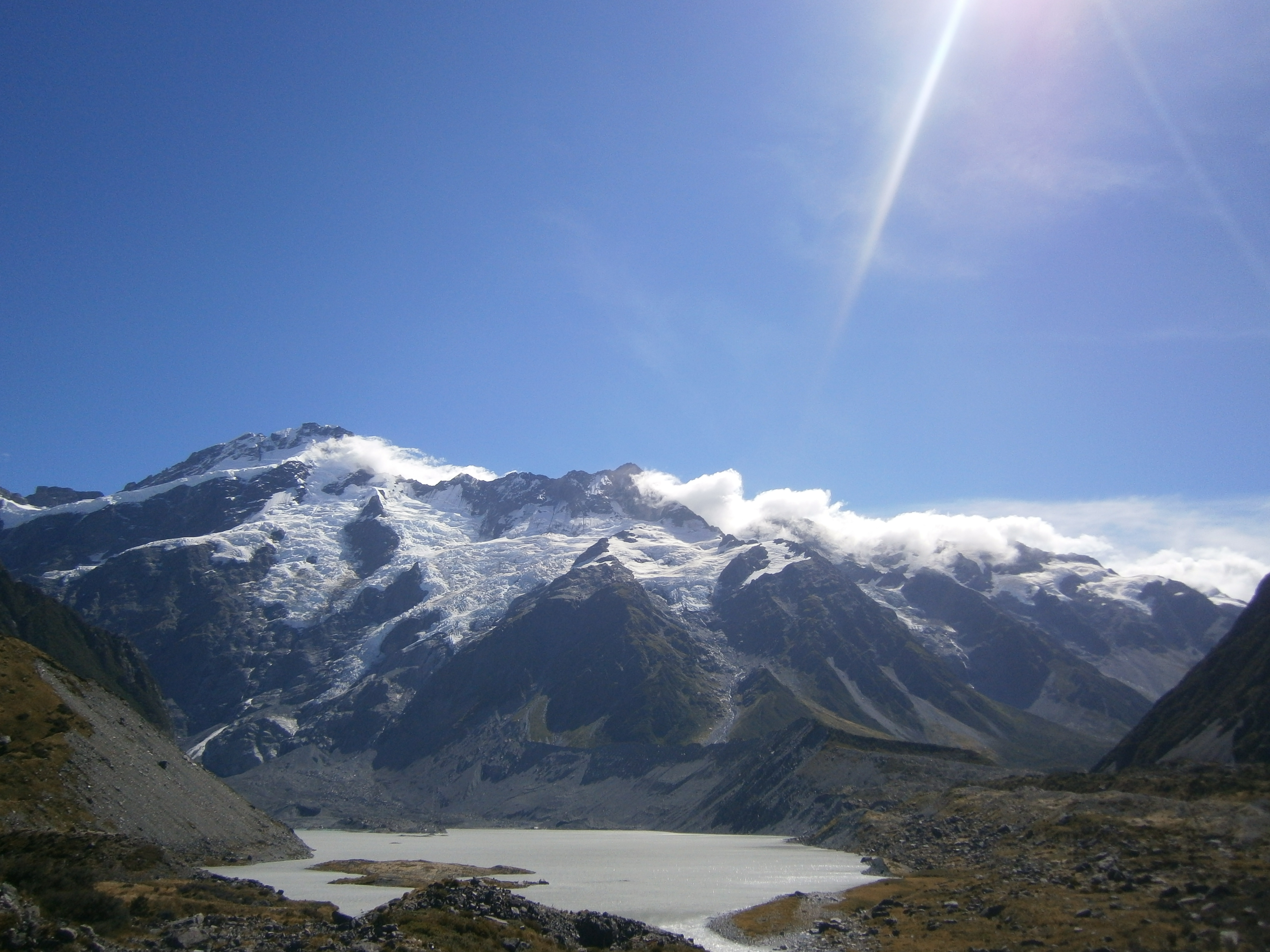 Waking up in the countryside in New Zealand is a brilliant feeling; the cool, fresh air is invigorating. I was a bit annoyed that we had to leave Lake Tekawa that morning but as we set on our way toward Mount Cook, we caught view of another lake, which was possibly more beautiful! We pulled into a rest stop on the side of the road to take a few pictures, one of probably 17 million rest stops in the country, they are much needed in a country where the landscape is so magnificent. Driving up to Mount Cook was equally impressive, it towered above us amongst mountains of snow-capped peaks, white clouds clinging to the jagged edges of the range.
