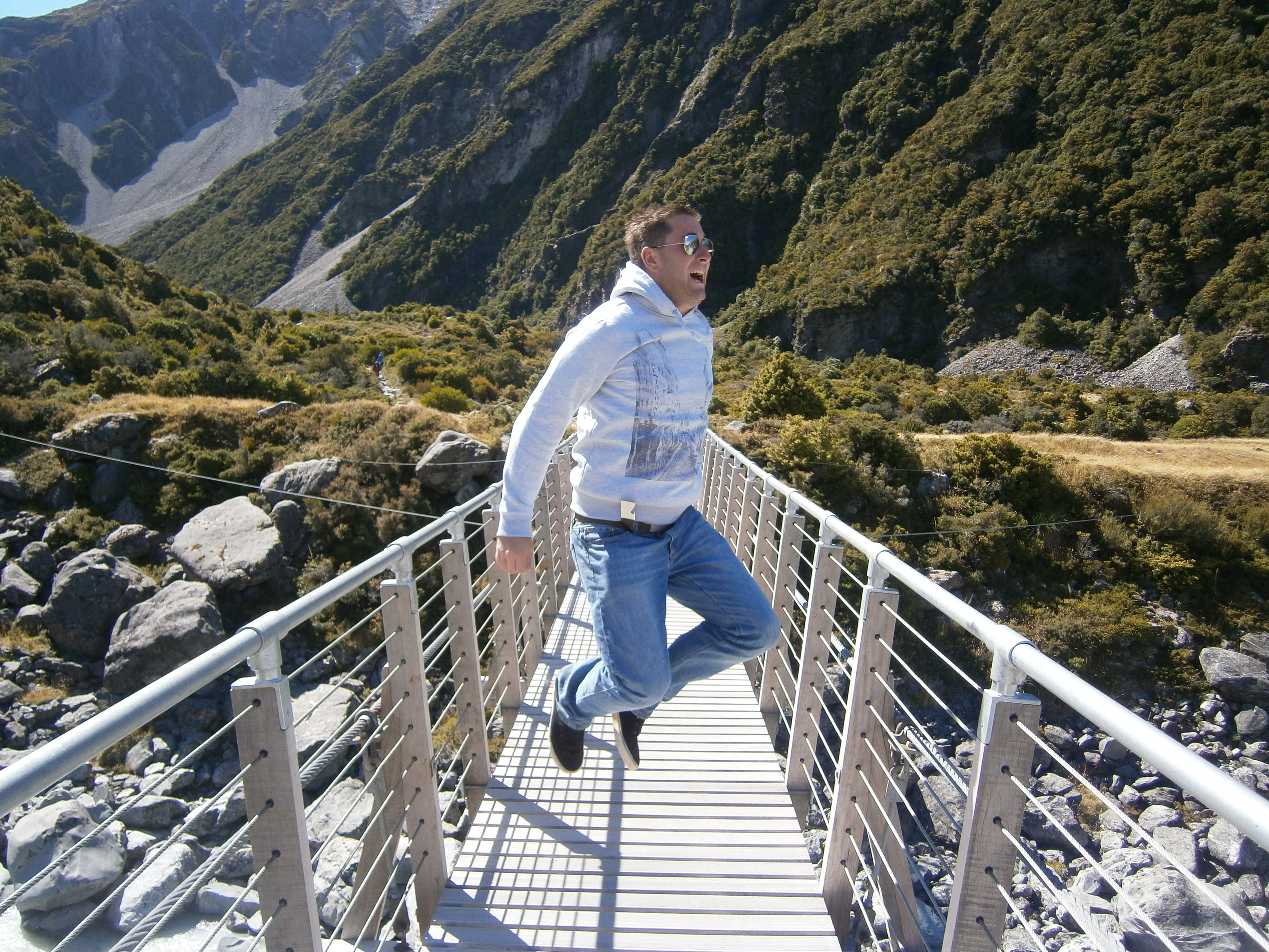 So for the first time in New Zealand we needed a day to relax. It’s not ideal to relax when you’re living in a van of course and the following day we were edging to get back to activities. So it was our last day in Queenstown and one of the famous daring things to do there is jet-boating. We went for the most expensive company, if you’re going to do something properly, splash out. It was fantastic, zipping down a narrow river , narrowly avoiding jagged rocks all around us, doing 360 degree turns at high speeds. Now even though we might seem daring, we were the youngest passengers on the boat… by about 30 years.